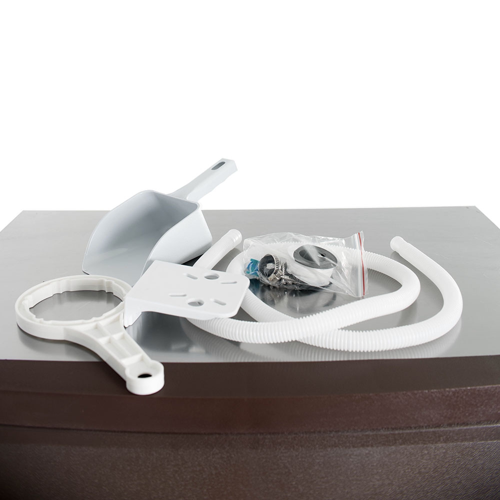 В комплект поставки входят фильтры, трубка для подключения и слива воды, ложка для выемки льда, поддон для сбора воды.