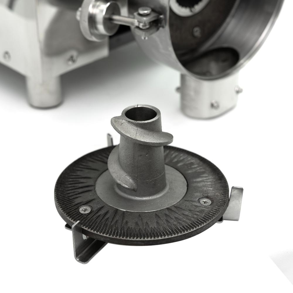 - Универсальность «два в одном». Сменный шнек позволяет не только измельчать сухие продукты, но и давить орехи, арахис, кунжут для получения ореховой пасты (урбеча). Это делает мельницу незаменимой на производствах здорового питания и в кондитерских цехах.