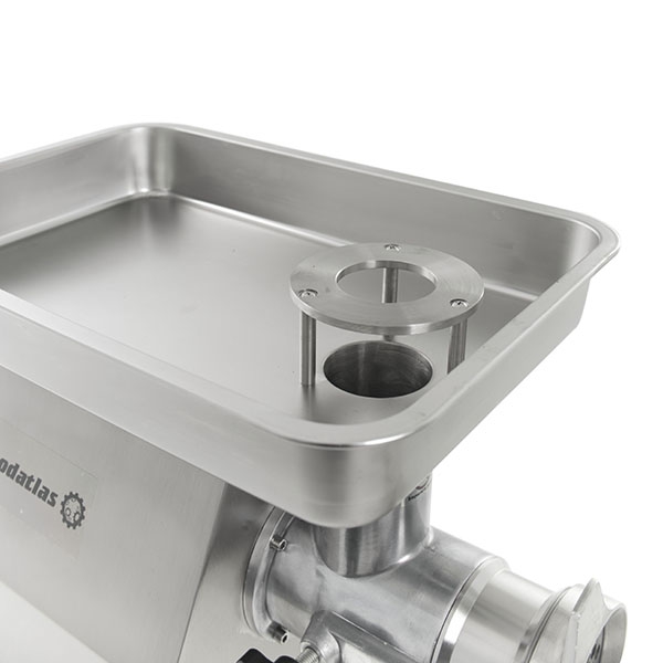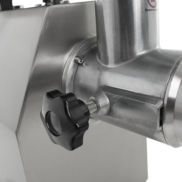 Подающий лоток вмещает большое количество мяса. А используя толкатель, можно принудительно подавать продукт вниз по желобу для измельчения. Удобные нескользящие ножки обеспечивают при этом устойчивость на столешнице.