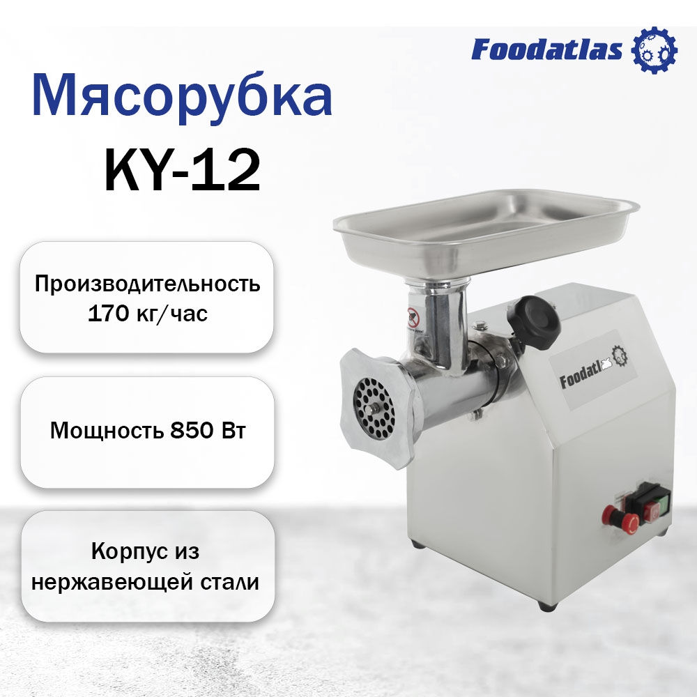 Мясорубка Foodatlas KY-12 предназначена для измельчения кускового бескостного мяса и рыбы. Измельченный мясной компонент используется для дальнейшего создания котлетных форм, наполнения колбас и т.д.