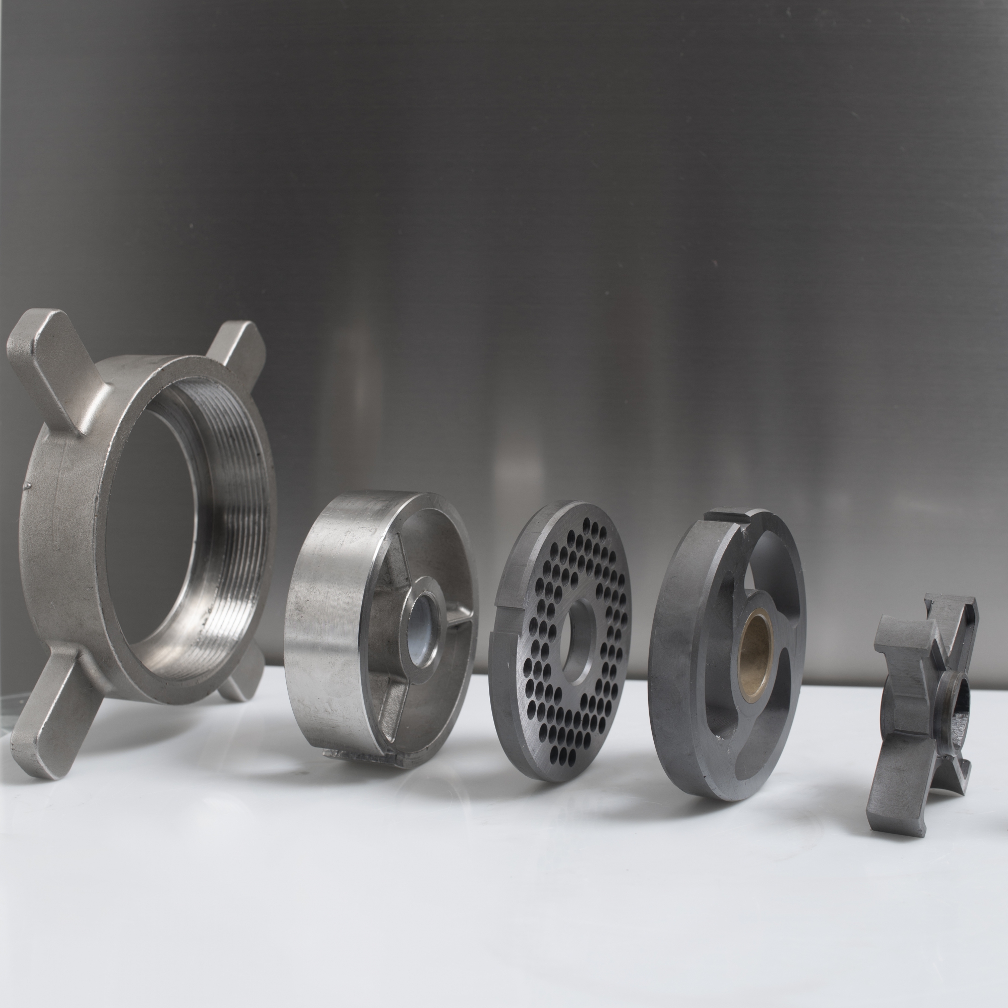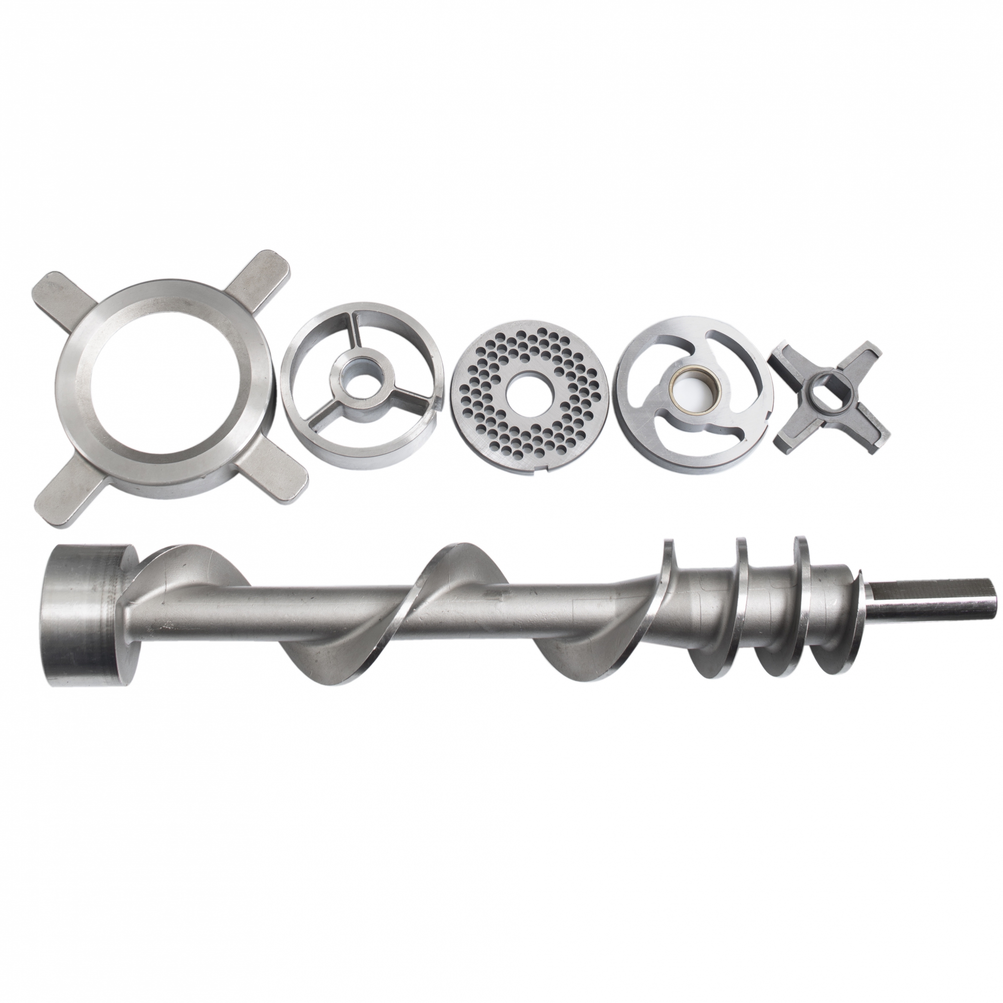 Волчок JR-120 относится к классу «Полный унгер»: ножевой комплект состоит из шнека, подрезной решетки (мерседес), крупной решетки, мелкой решетки (5-7мм), двух четырехлепестковых двухсторонних ножей, гайки крепления, развертки (ввертыш).