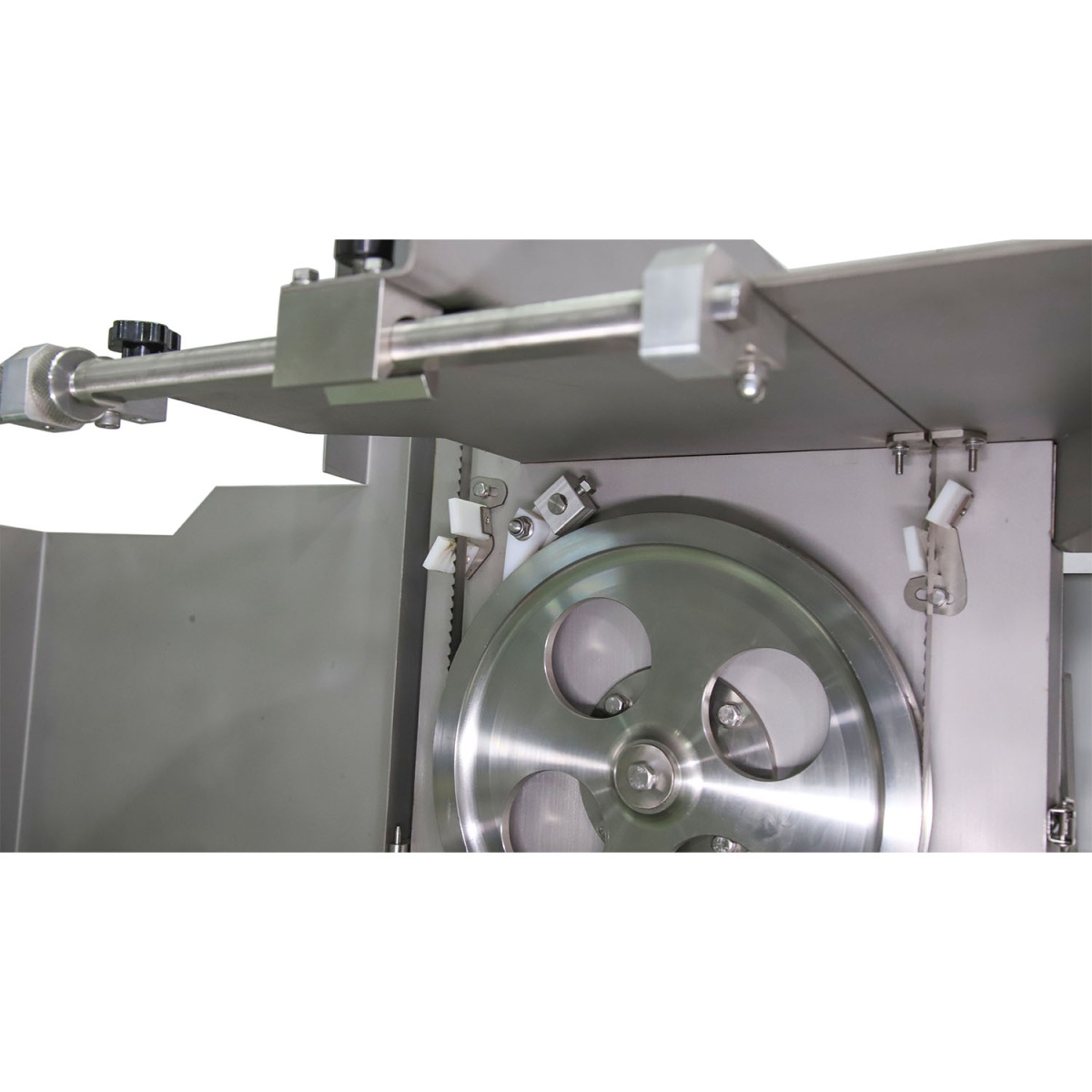 Пила оснащена четырьмя колесными опорами с тормозом - это позволяет легко перемещать ее внутри цеха. Для безопасной эксплуатации имеется датчик на открытие крышки и кнопка аварийной остановки. Шкивы имеют два бортика, что полностью предотвращает соскальзывание пильного полотна со шкивов, также на шкивах имеется специальная проточка для зубьев пильного полотна. Очистители шкива и полотна подпружинены, и поэтому работают в автоматическом режиме и не требуют регулировки.