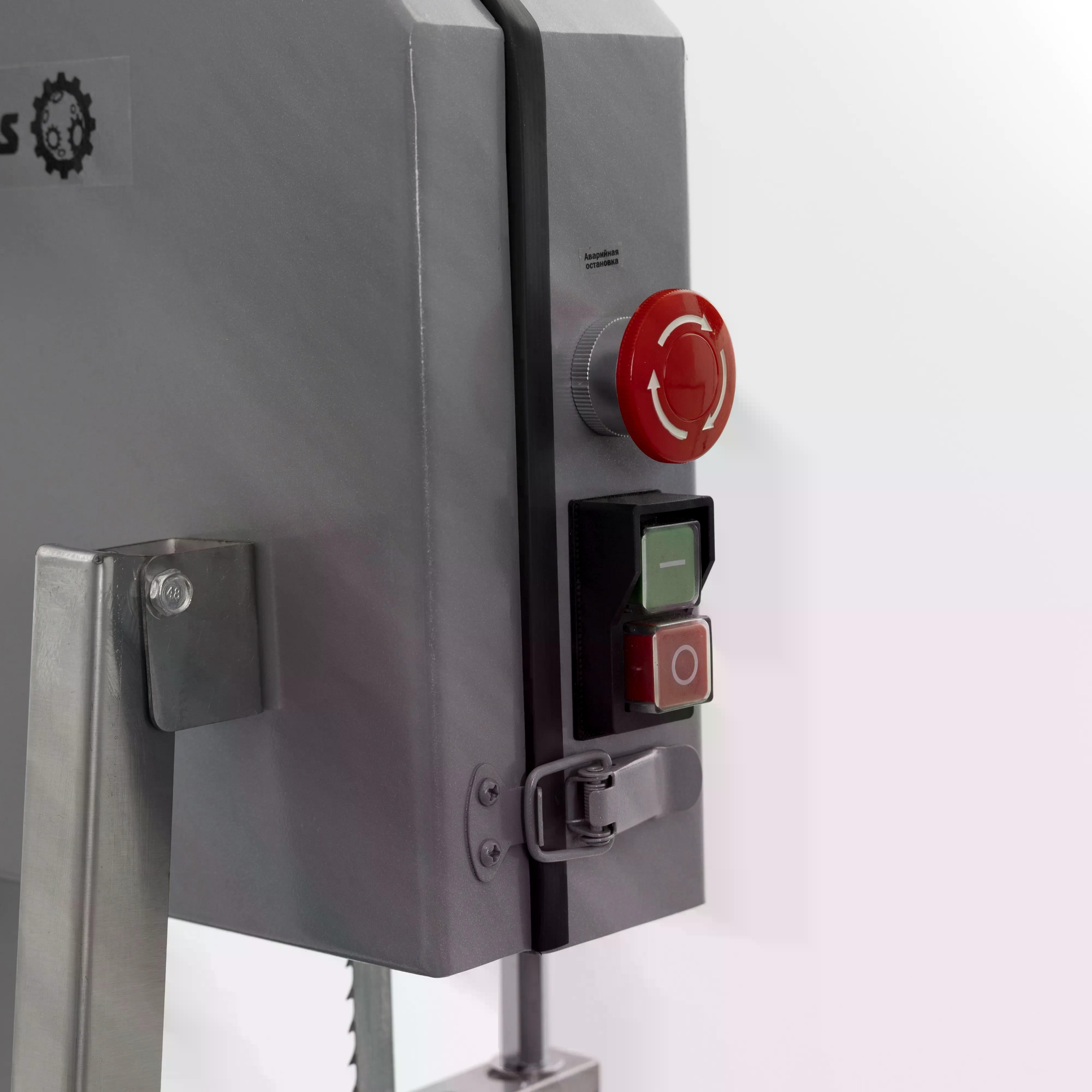 Панель управления ленточной пилы FA-280A – кнопка “Пуск”, “Стоп”, “Аварийный стоп”, лампа питания. Панель управления имеет нижнее расположения.
