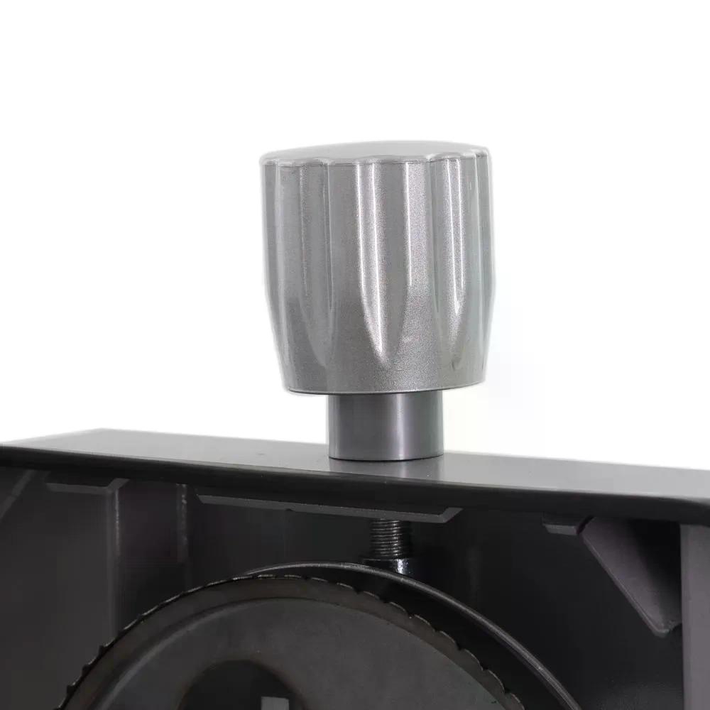Внешняя закрывающая панель пильного полотна выполнена в единой конструкции для удобства снятия/установки полотна и обслуживания/очистки шкивов. Ведомое колесо (шкив) имеет регулировки по натяжке и наклону полотна – для более расширенного использования разнообразных полотен. Регулировка полотна (натяжение) выполнена в виде рукоятки под пружинным механизмом.