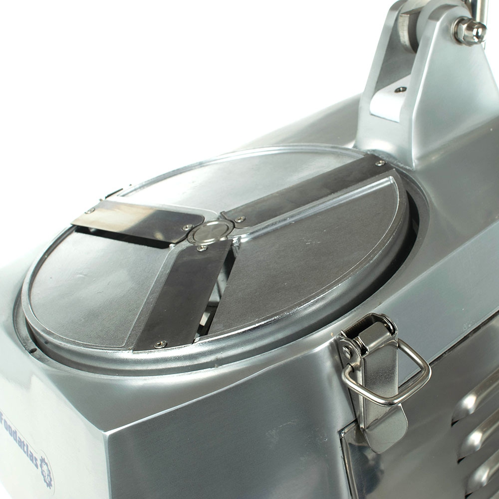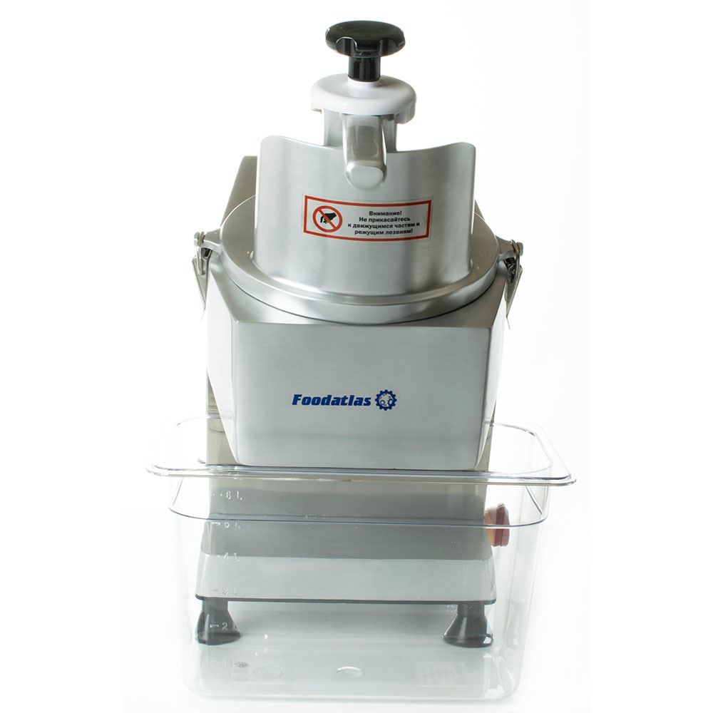 Оборудование укомплектовывается 5 ножами для нарезки ломтиками, соломкой, пластинками, кубиками. Все кусочки имеют одинаковый размер. При этом сохраняется внешний вид, текстура и сочность продукции.