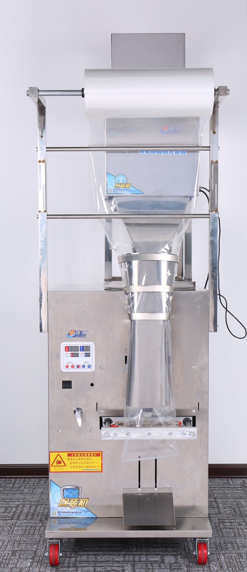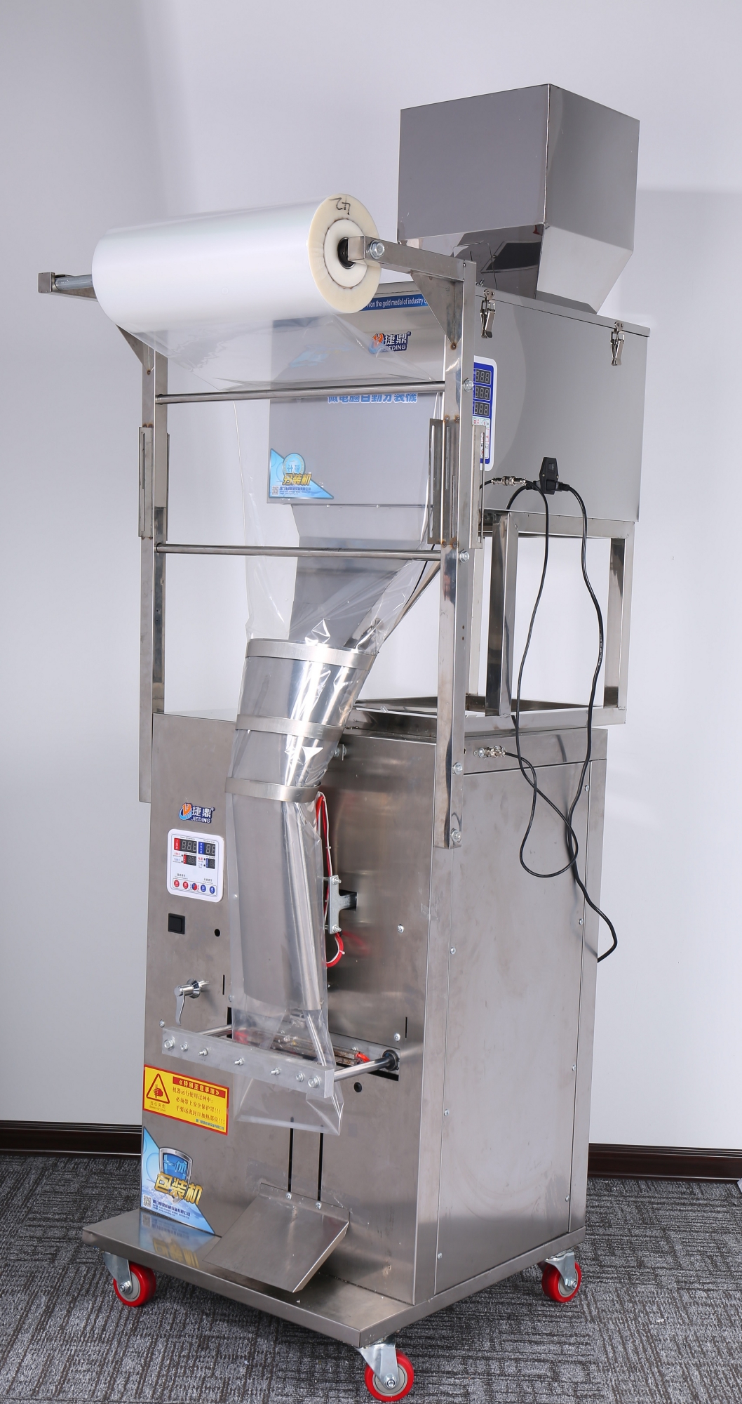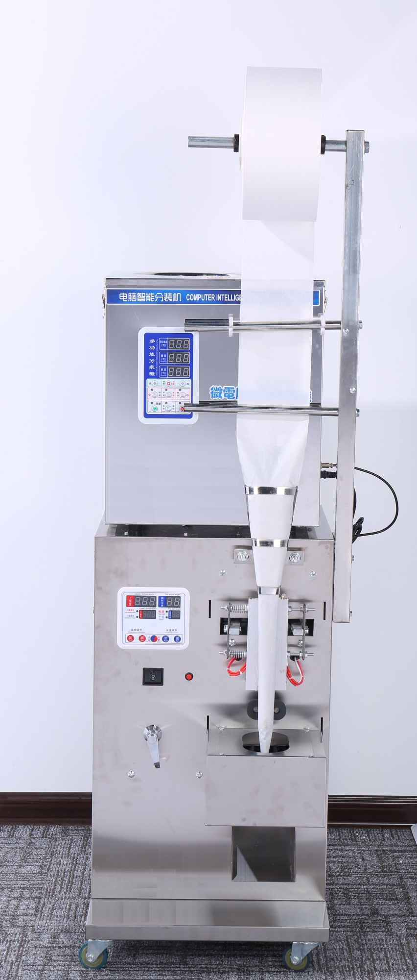 Автомат MAGIKON AVWB500I состоит из двух модулей: упаковочной машины с электрическим запаечным приводом и весового дозатора с диапазоном дозирования от 10 до 500 гр. Для экономии пространства и более удобной работы оператора дозатор размещен на упаковщике. Настройки дозации осуществляются на цифровой панели управления. Ввод параметров работы упаковщика производится посредством собственной панели управления. Машина оснащена датчиком фотометки, который позволяет работать с прозрачными, цветными и дает возможность использовать упаковочные пленки с рисунком.