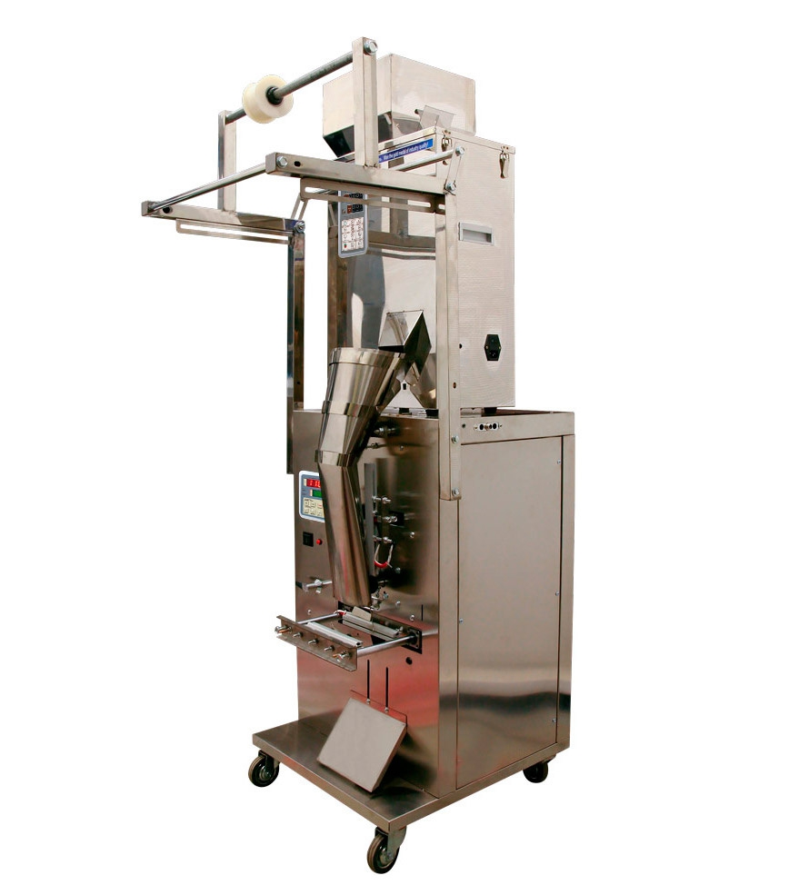 Принцип работы фасовочно-упаковочного автомата MAGIKON AVWB500IIP: оператор засыпает продукт в бункер, дозатор скидывает отмеренную дозу в блок формирования упаковки, где пакет запаивается, обрезается и собирается оператором либо движется далее.
