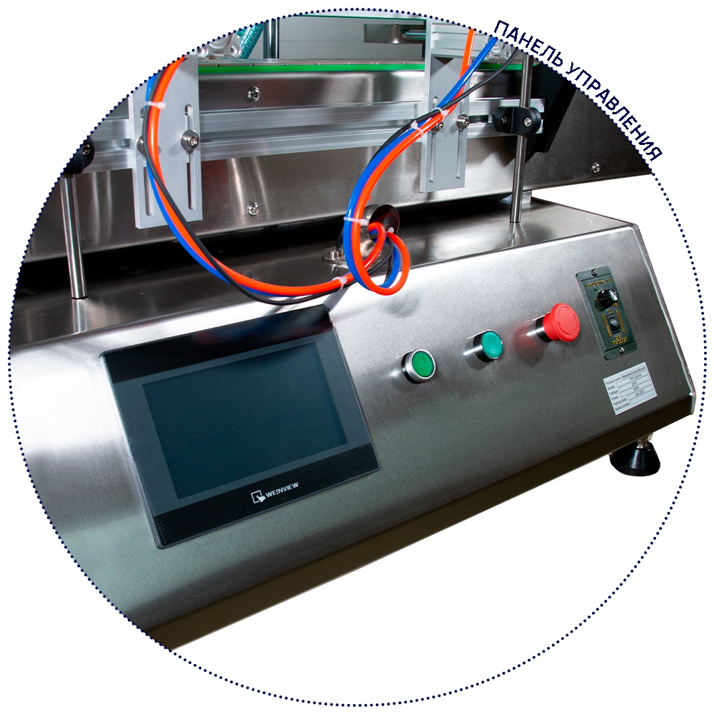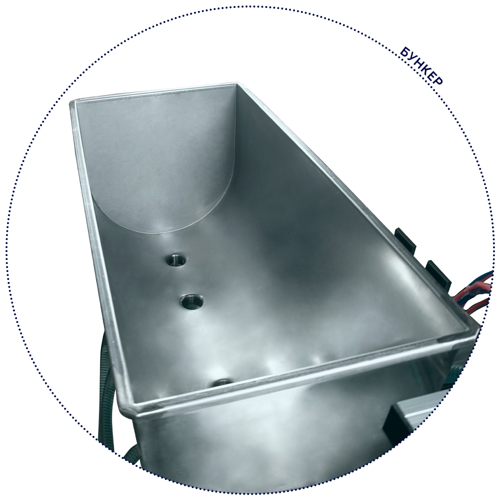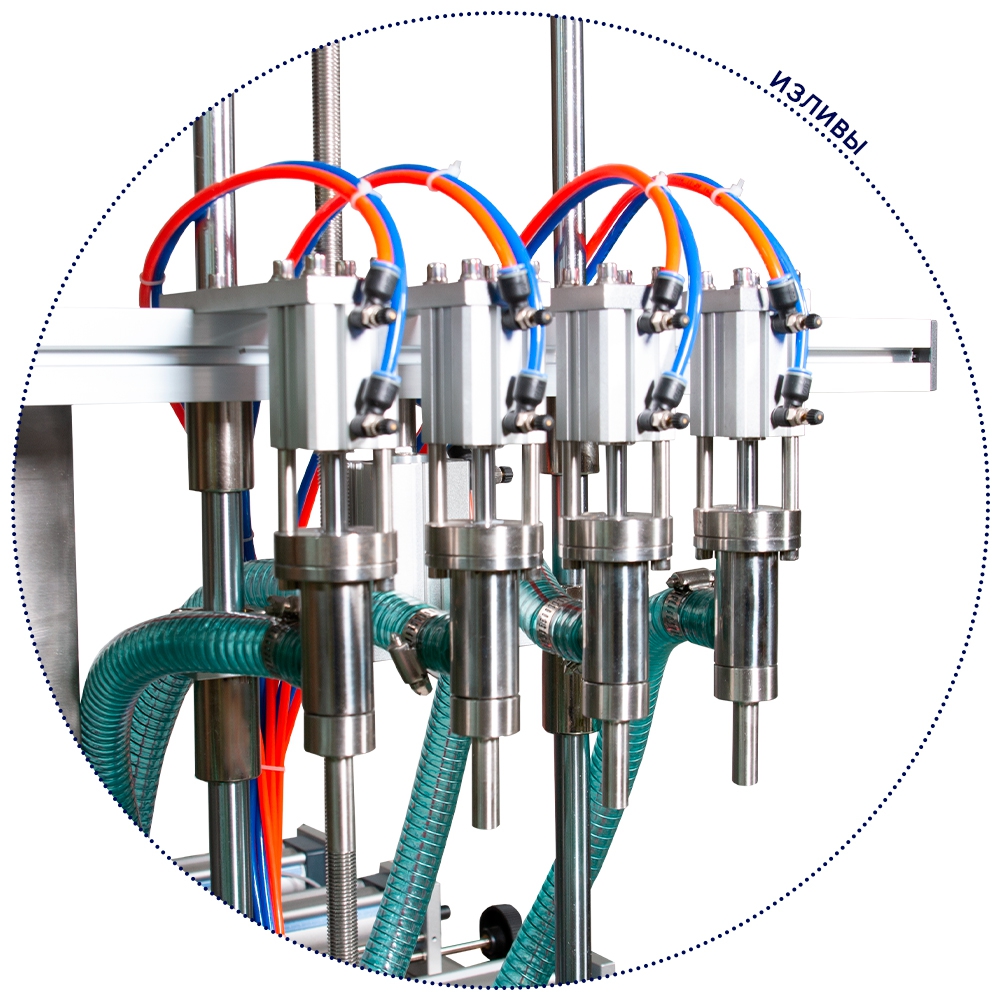 Оборудование оснащено высокоточным поршневым дозатором, который обеспечивает точное дозирование жидкостей. В стандартной комплектации на дозаторе установлено 4 излива, при необходимости, возможны комплектации под заказ с 2 или 6 изливами. Управление дозатором осуществляется оператором на мониторе. Корпус оборудования выполнен из нержавеющей стали, что обеспечивает его долговечность и устойчивость к коррозии. Если требуется дозирование определенного вида жидкости, можно установить опциональный бункер с перемешиванием и подогревом. В стандартной комплектации есть перемешивание в бункере.