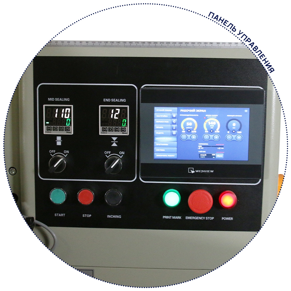 - Машина оснащена тремя серводвигателями и программируемым контроллером, длина отреза пакета определяется датчиком, что позволяет экономить время и пленку.