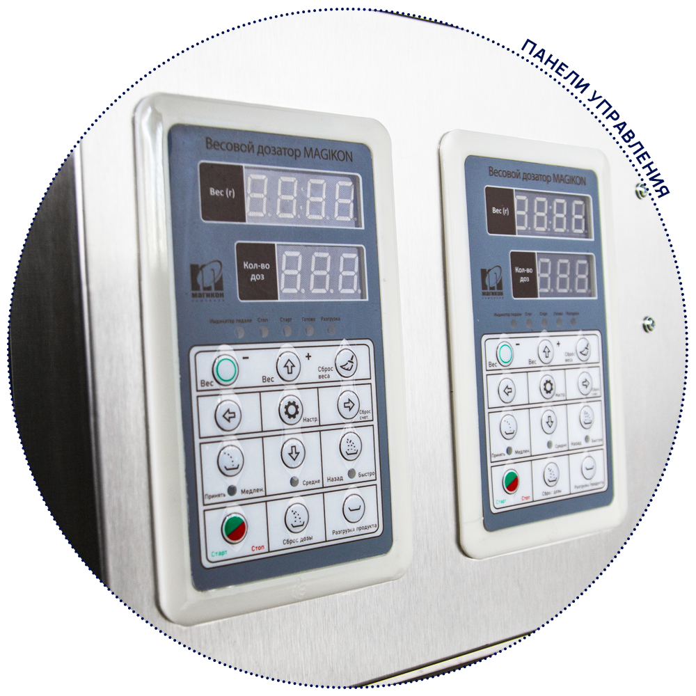 Дозаторы работают в полуавтоматическом режиме. Оператор наполняет бункер продуктом, выставляет на панели управления нужную дозу (в диапазоне, согласно тех. характеристик выбранного дозатора) и установив тару для продукта под воронкой сброса нажимает на педаль.За счет двух линий подачи и взвешивания продукта MAGIKON W2B3000Т обладает большей производительностью.