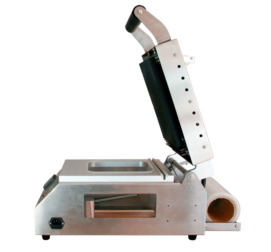 Принцип работы ручного запайщика лотков MTS-03C достаточно прост: контейнер с продуктом вручную размещается в матрице. Размер посадочного места должен соответствовать размеру лотка по периметру, при этом высота лотка может быть разной. Оператору необходимо вытянуть пленку из рулона (установленный на оборудовании) и полностью накрыть контейнер, затем закрыть крышку, прижав к лотку. Пленка под действием температуры (устанавливается на термоконтролере в зависимости от толщины и состава пленки) припаивается к контейнеру, а остатки пленки обрезаются встроенным ножом.